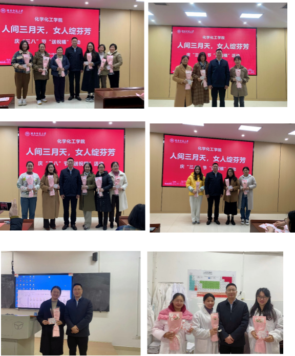 谭东波向在场的每一位女教职工赠送鲜花与贺卡,并亲自把这份礼物送给在在课堂以及实验室开展教学和研究的每一位女教职工。