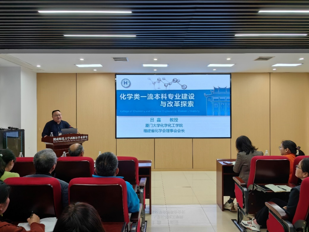 (供稿:荣春英)4月11日下午,国家杰出青年科学基金获得者、教育部高等学校大学化学课程教学指导委员会委员、国家级线下一流本科课程《结构化学》主持人、福建省化学会理事会会长、厦门大学吕鑫教授做客学院西维尔报告厅做教育教学报告,学院系主任、专业负责人、教研室主任、化学专业教师等三十余人参加。