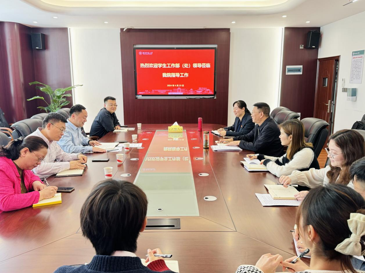 (通讯员 唐健清)4月23日上午,校学生工作部(处)部(处)长鲁良,副部(处)长彭露、罗元,心理健康教育与咨询中心主任余洁一行到我院调研指导工作,学院党委书记谭东波,党委副书记段婷出席座谈会。