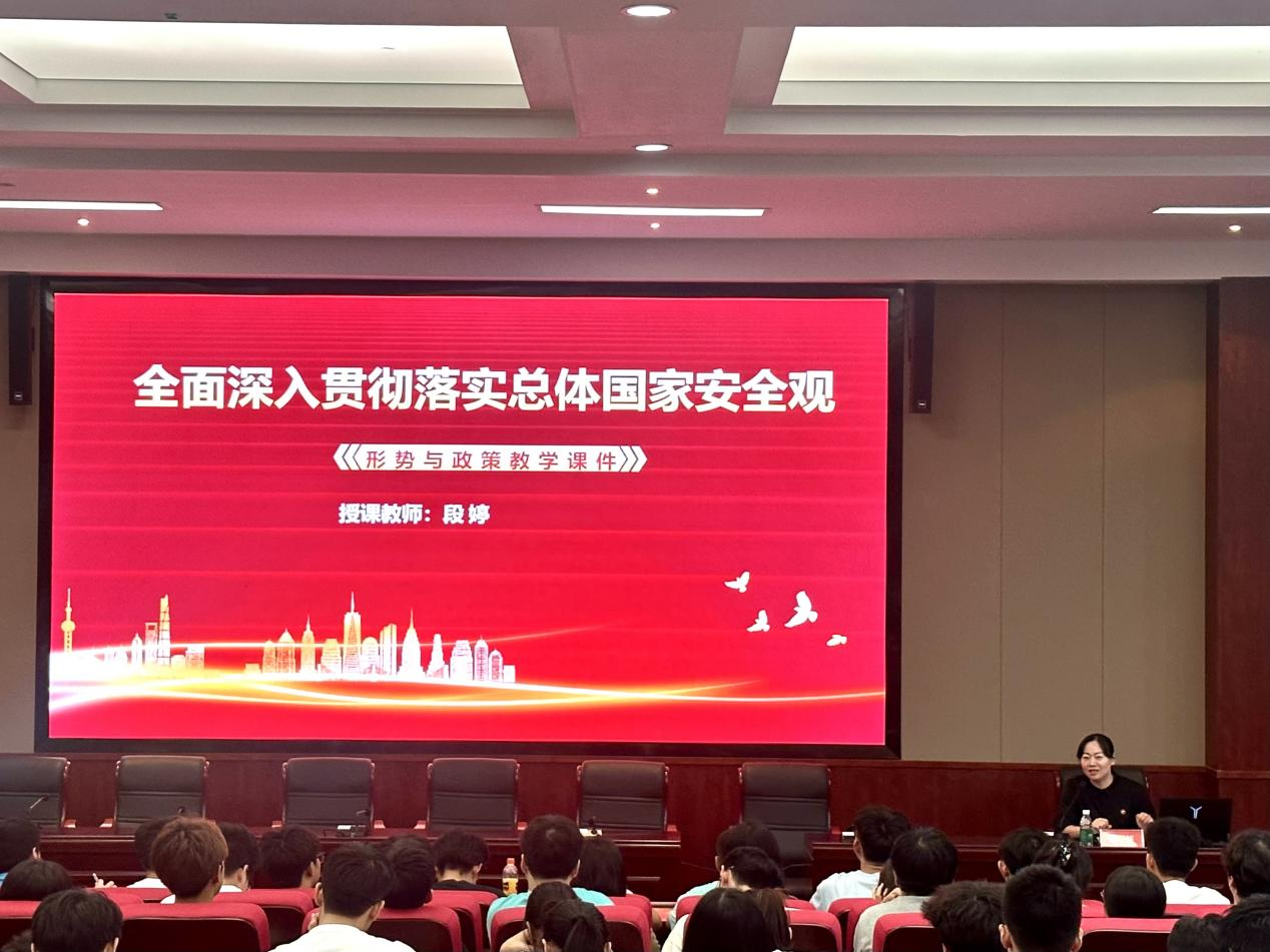 (通讯员 许佳慧 张晓晨)6月12日中午,学院党委副书记段婷在达嘉维康报告厅为2023级本科生讲授以“全面深入贯彻落实总体国家安全观”为主题的“形势与政策课”。讲座由2023级辅导员唐健清主持。