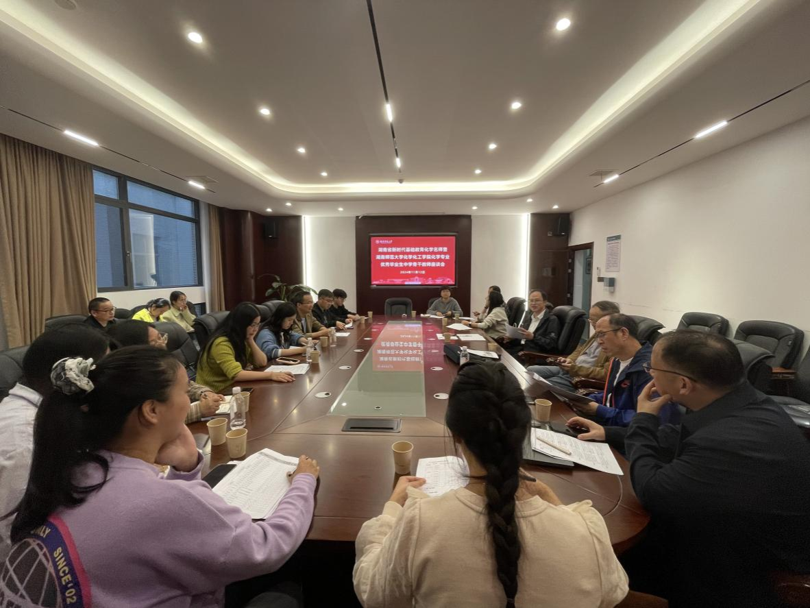 座谈会由谭亮主持。谭东波对各位优秀校友回到母校学习交流表示热烈欢迎,并简要介绍了学院近年来在学科和专业建设、人才培养等方面取得的成绩。在交流环节中,中学名师、青年骨干教师们纷纷发言,他们对学校和学院优美的环境赞不绝口,深情回顾了大学期间的求学时光,表达了对母校和学院的深厚情谊与感恩之心。龙路云、谢如良等中学名师给青年教师成长建言献策,强调教育情怀是教育工作的内在要求,扎实的学科素养和专业知识是教育工作的基础。青年骨干教师们分享了各自的工作经历和成长轨迹,交流了在课程教学、班级管理与学生德育等方面的心得体会,并对学院师范生人才培养、实践技能训练等提出了建议和意见。湖南省教学名师尹笃林教授表示,“国培计划”高端研修项目既是促进中学化学青年骨干教师成长的平台,也是学院与优秀校友沟通交流的桥梁,看到优秀校友们迅速成长感到非常欣慰。