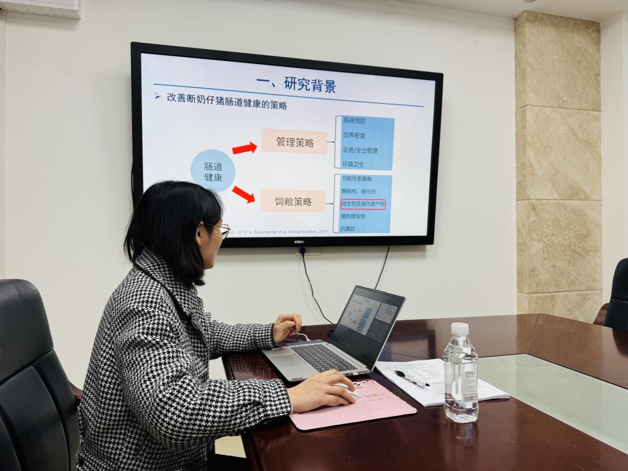 会上,马元鸿教授介绍了尹蓝梅个人基本情况及在站期间取得的科研成果。尹蓝梅以《吲哚乙酸及色氨酸代谢物对猪肠道功能的调节作用研究》为题作出站报告,从研究背景、研究意义、研究结果、研究总结等方面进行了详细的汇报。