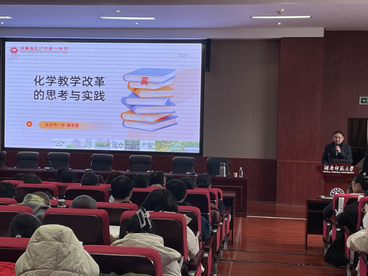 杨志坚老师坚持“学生中心”的教育教学理念,凭借深厚的专业造诣与高度的教育热忱,全身心投入基础教育事业中。本次授课以“化学教学改革的思考与实践”为主题,分享了教学生涯中的一些心得与体会。他认为培养科学精神与人文素养同样重要,学生有必要明晰投身教育事业的深刻内涵与价值所在。他结合长沙市一中的化学教学实践,介绍了探究式教学法、跨学科融合—化学+、化学实验创新、智慧课堂等创新实践探索,聚焦化学教学领域的创新实践维度,注重提升教师的课程设计、组织能力以及知识整合能力,构建教师完备的培养体系,树立“德育为先”的教育理念。这对于师范生职前规划和教育情怀的培养具有重要的引导作用。