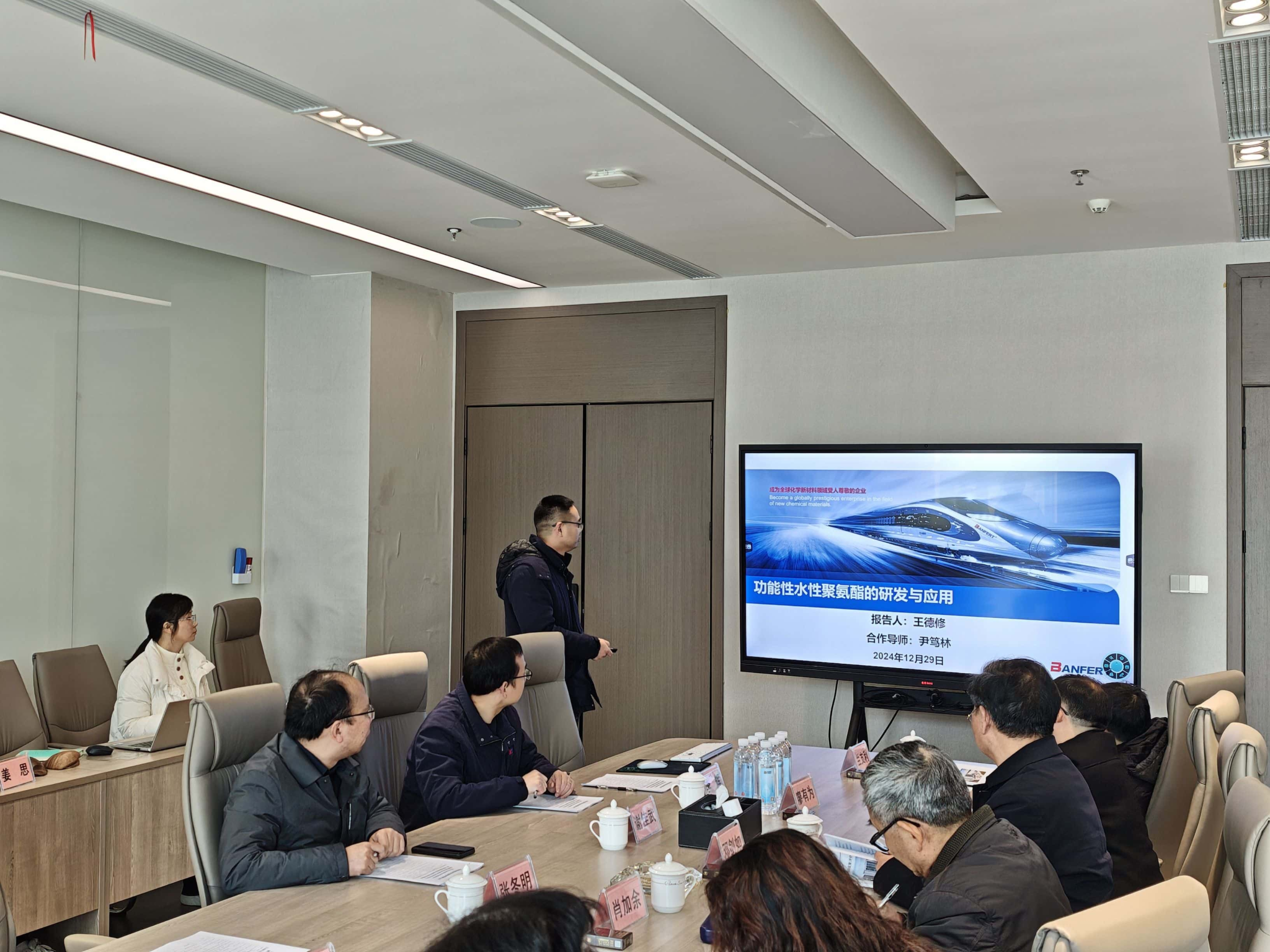 会上,尹笃林教授介绍了王德修的个人基本情况及在站期间取得的科研成果。王德修以《功能性水性聚氨酯的研发与应用》为题作出站报告,从研究背景、研究意义、研究结果、研究总结等方面进行了详细的汇报。