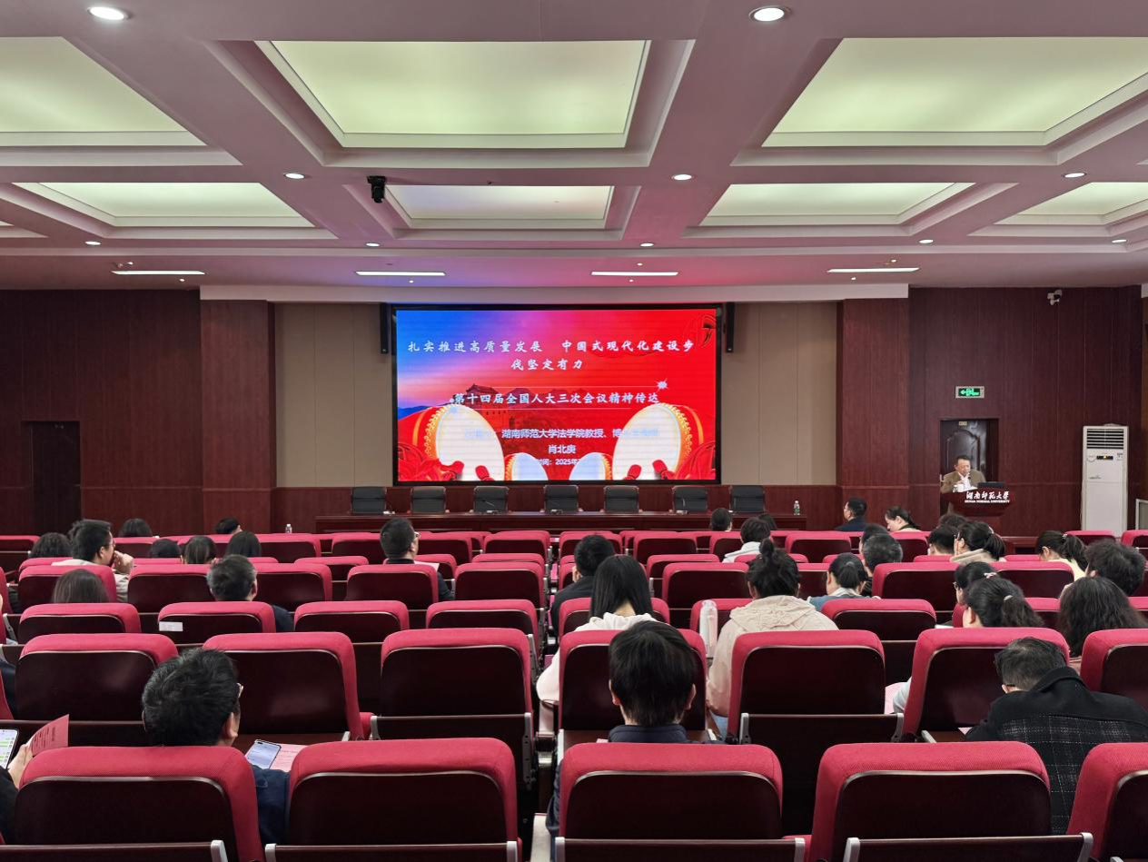 会上,法学院肖北庚教授以《扎实推进高质量发展,中国式现代化建设步伐坚定有力》为主题,从人民代表大会的盛况、大会主要精神、湖南代表团履职情况、个人履职情况等4个方面介绍了第十四届全国人民代表大会第三次会议的精神。