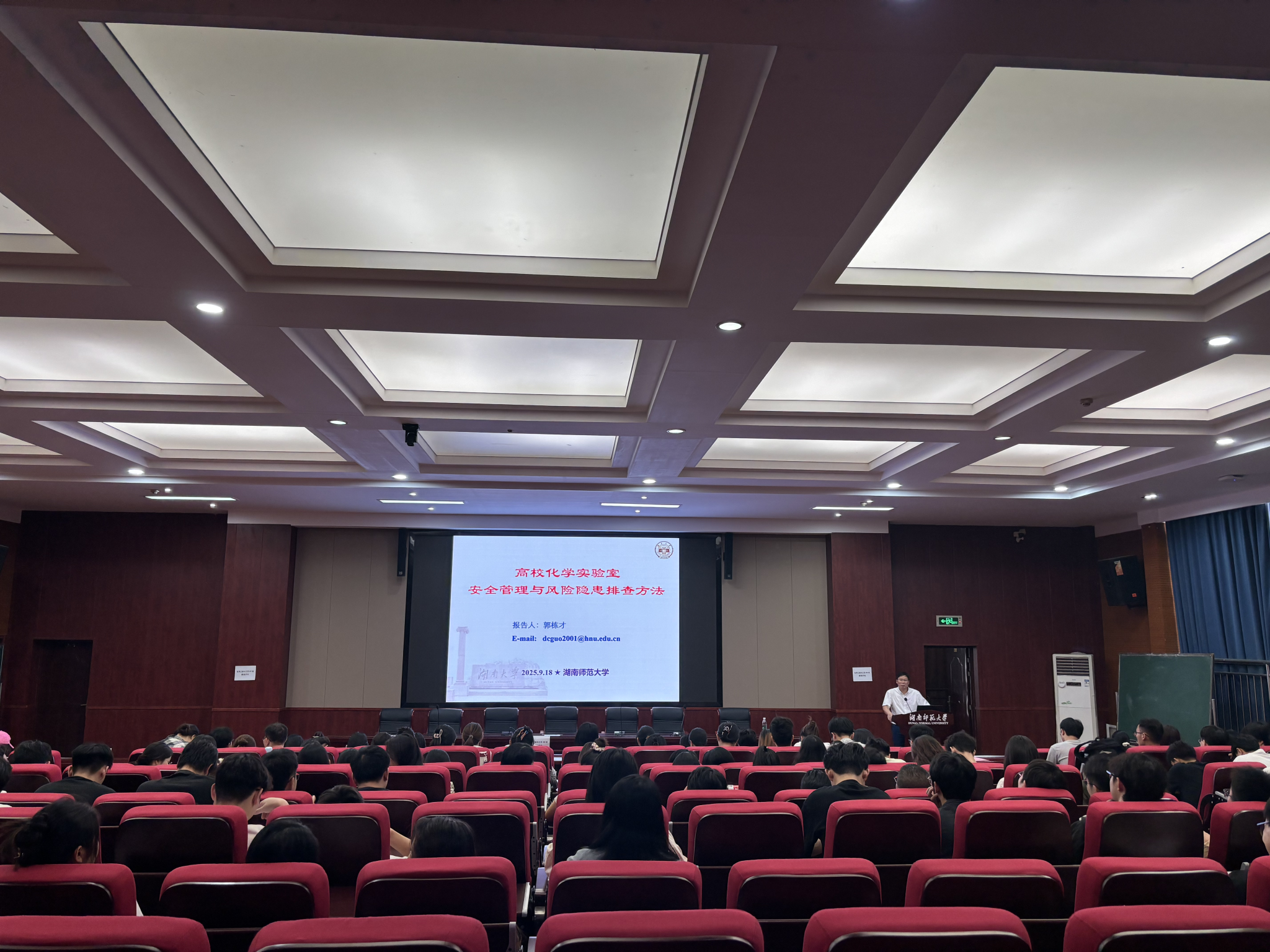 2025年9月18日下午,湖南大学伟德国际1949国家级实验教学示范中心主任郭栋才教授受邀来我院,在化学楼达嘉维康报告厅开展安全教育讲座。讲座由研究生办唐建如老师主持,2025级200余名研究生新生参加了此次讲座。