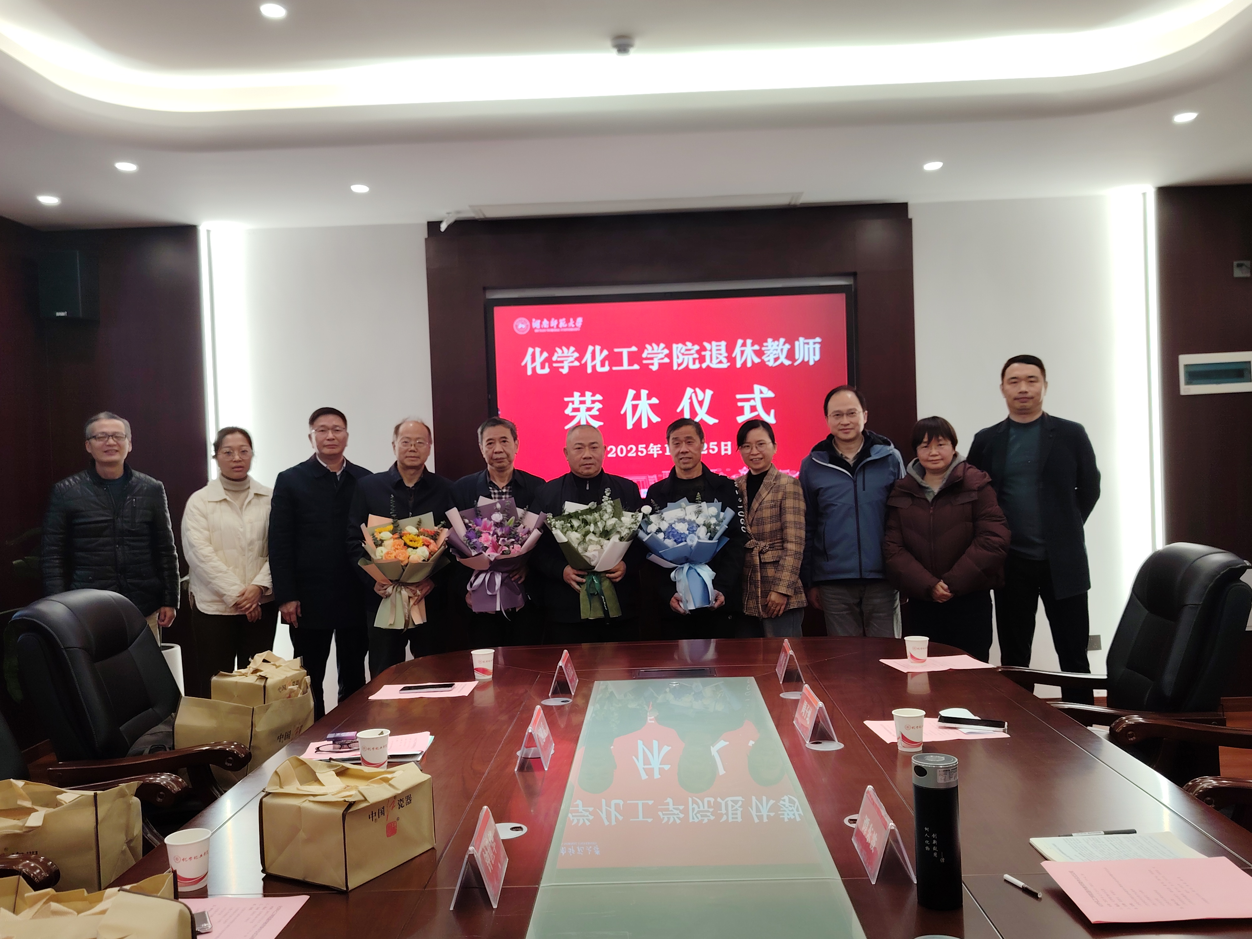 随后,教工代表们献上鲜花,并与退休教师们合影留念,共同记录下这珍贵的时刻。
