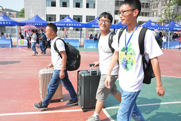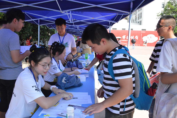 青传和社联的工作人员在体育馆篮球场搭建登记注册点,进行扫码迎新,发放一卡通校园卡,并安排相关人员引导19级新生去寝室和化工院。学生会和团委的工作人员在化工院报告厅发放军训服,办理银行卡、电话卡、疫苗、保险等相关工作。