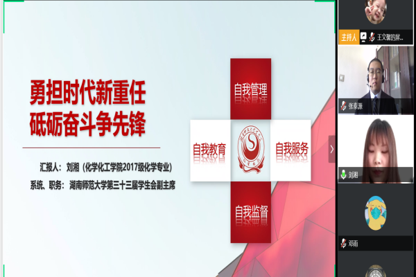 (通讯员 邹彪 张泰源)受疫情影响,4月25日9:30,伟德国际1949通过网络会议召开2019-2020学年度团学组织述职大会。化工院党委副书记罗艳老师、院团委书记屈杜炜老师、学工办辅导员熊慈老师、付玉丽老师、杨魏鹏老师出席大会。会议由团委发展部张泰源主持。