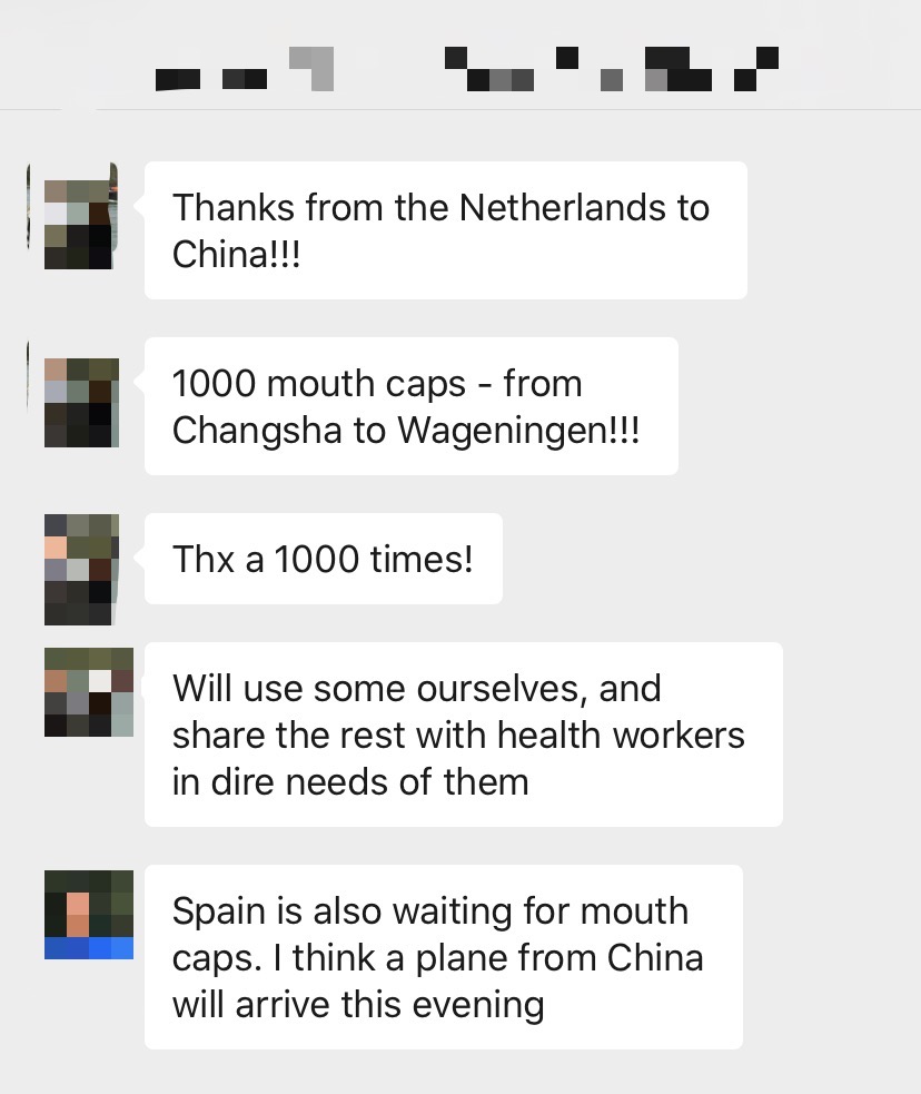 非常不幸的是,在她回国没多久,荷兰疫情大爆发了。而此时的祖国,正在逐步复工复产,医疗物资的生产储备逐步增多。看到那些曾经帮助过她的善良人们正处在水深火热中,非常揪心。于是黄思老师3月25日从国内购买了1000只一次性口罩通过国际快递寄到了荷兰,于3月31日到达荷兰。当地的朋友非常地感动,发来感谢。