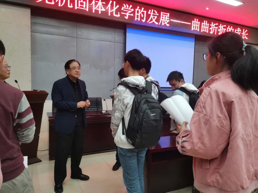 钱逸泰院士围绕“无机固体化学的发展”,阐述了国内外无机固体化学的发展情况,介绍了其课题组几十年来在纳米材料合成与晶体生长、介稳相材料的合成、二次纳米电极材料等方面所取得的研究成果,分享了自己在逆境中不断追求、永不放弃的科学家精神。在互动环节,学院师生积极踊跃发言,钱院士就师生提问进行了回复。