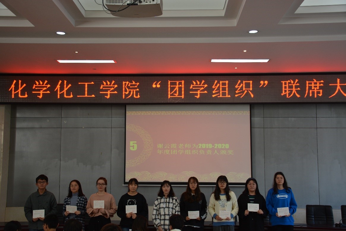 会议伊始,主席团成员依次上台对工作内容进行介绍。随后,屈杜炜、欧阳唯一和谢云霞为2019-2020年度团学组织负责人颁奖并合影留念。屈杜炜表示,作为化工院的学生干部,各部门负责人应当树立好形象,成为老师和同学之间的沟通桥梁,同时还要处理好工作和生活中的细节,保持良好的工作作风和创新精神。 欧阳唯一通过自身的大学经历对同学们进行了激励,她认为学生干部要认真对待每一项工作,并对每次工作进行计划和总结,以便发现工作中的不足。谢云霞表示学生工作者要从点滴小事做起,以良好的形象展现自我。她希望学社管要举办好每一次的活动,做好区校共建,让社员们都学有所得。