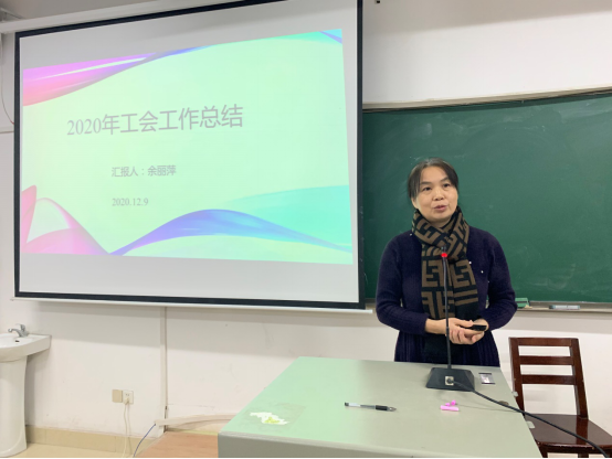会议在庄严的国歌声中拉开帷幕。院工会主席余丽萍从年度活动开展情况、抗疫学习主题教育、插柳扶贫特色工作以及关爱师生等方面作2020年院工会工作总结报告。