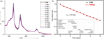 图2. (a)化合物11Ni的紫外可见吸收光谱随时间变化谱图;