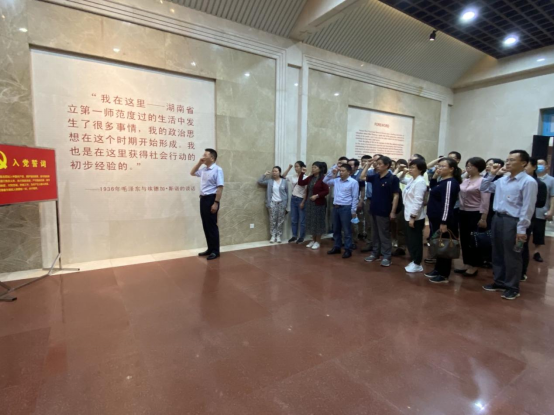 在讲解员的带领下参观了一师范的大礼堂、教室及多个展厅。生动的图片与文字,再现了第一师范先辈们的丰功伟绩,展现了各位革命先驱、教育前辈由爱国学生到职业革命家的转变历程。党员们对青年毛泽东在第一师范的学习工作经历以及在学校期间的思想成长历程有了更深刻的认识。