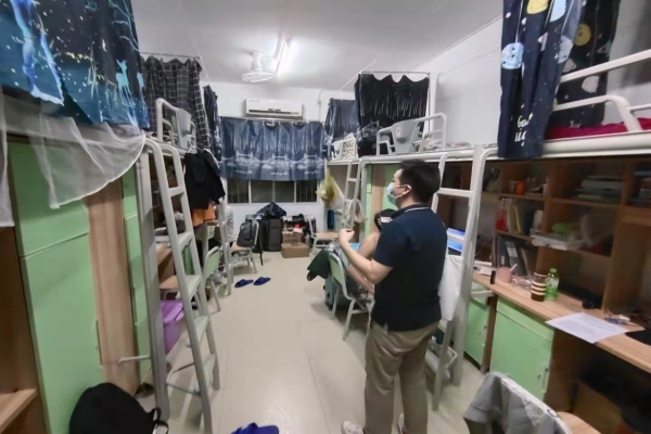 学工办辅导员分成3组,分别对化工院学生主要集中的江边一舍、江边二舍、江边五舍共计79间宿舍进行检查。检查过程中罗艳副书记对学院同学进行叮嘱,最近疫情反复,注意个人卫生,经常通风透气,做好疫情“日报告,零报告”的日常汇报工作,疫情防控,做好自己健康的第一责任人。提醒同学们每天在22:30之前要回到宿舍,寝室长要做好同学回寝提醒,若未按时回寝一定做好电话联系和上报工作。