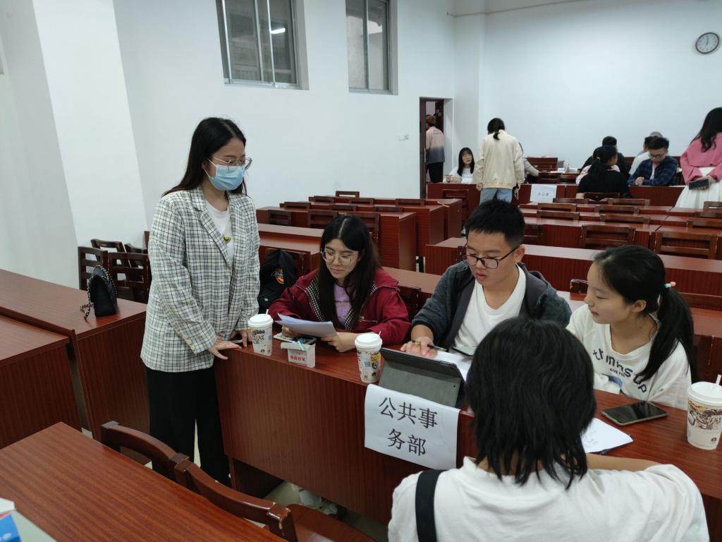全体报名同学在化工院一楼大厅候场,按照部门顺序分别进行面试,各个部门主要围绕着为什么参加该部门、对部门的了解情况、如何平衡工作与学习等问题进行面试。第一轮面试后,根据同学们的志愿分别进行调剂,直至各部门招满干事,此次招新活动结束。