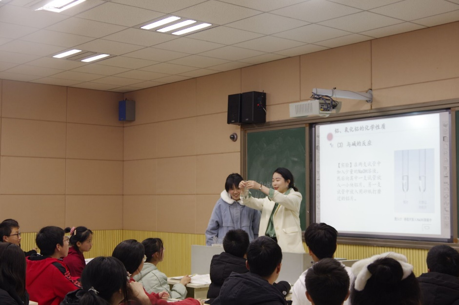 桂东一中实习队开展了实习汇报课展示活动。实习老师危赢准备充分,利用视频、图片和生活案例与教师讲解有机结合,展现了一堂精彩的汇报课“铝和铝合金”。汇报课结束,危赢阐述了课堂的设计思路,桂东一中的指导老师李本宏老师、桂东一中郭雪峰校长和谭亮副院长对此次汇报课先后进行了点评。谭亮对危赢的课堂表示肯定,赞扬了课堂中核心素养的体现,并提出行之有效的建议。