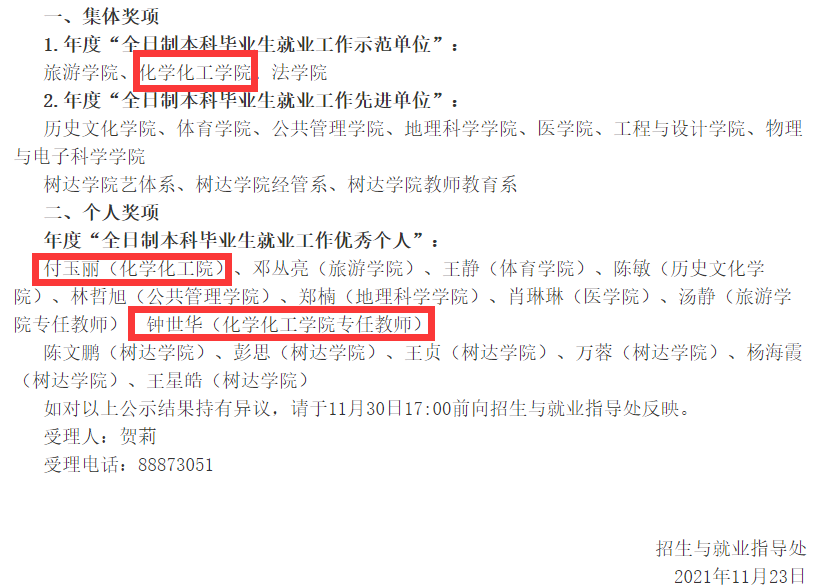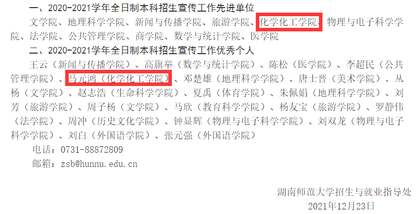 近日,化工院在2020-2021学年全日制本科招生与就业工作中取得佳绩。在招生工作方面,化工院荣获2020-2021学年全日制本科招生宣传工作先进单位,化工院马元鸿教授荣获2020-2021学年全日制本科招生宣传工作优秀个人。在就业工作方面,化工院荣获年度“全日制本科毕业生就业工作示范单位”,化工院钟世华教授和付玉丽老师获评年度“全日制本科毕业生就业工作优秀个人”。