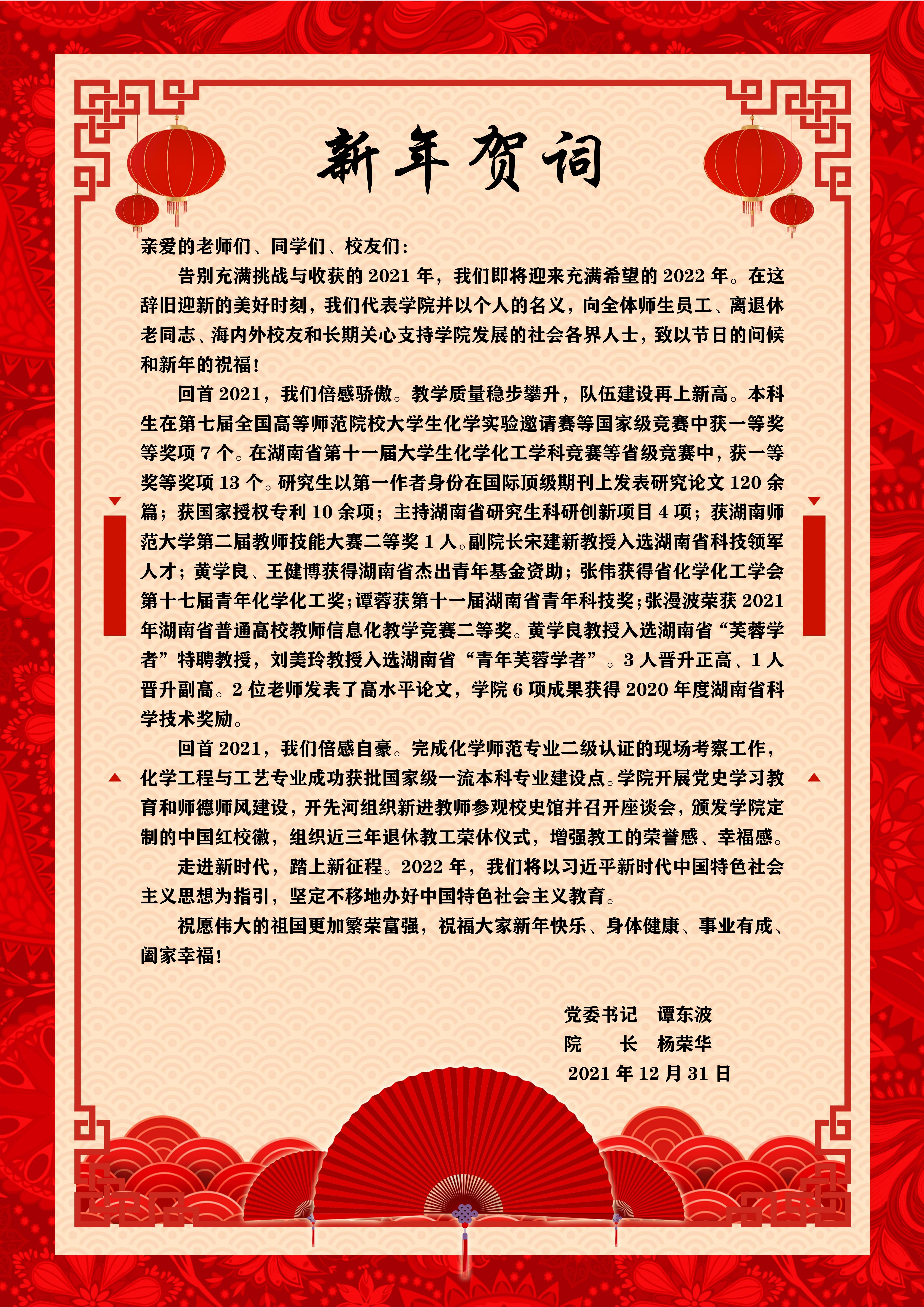 告别充满挑战与收获的2021年,我们即将迎来充满希望的2022年。在这辞旧迎新的美好时刻,我们代表学院并以个人的名义,向全体师生员工、离退休老同志、海内外校友和长期关心支持学院发展的社会各界人士,致以节日的问候和新年的祝福!