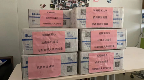 4月3日,一箱箱贴有“祝湖南师大抗‘疫’早日成功,与湖南师大共克时艰”的爱心口罩运抵伟德国际victor1946,经过志愿者仔细的消杀后,将分发到师生的手中。广州彼西络科技有限公司的慷慨解囊不仅为学校疫情防控工作提供了物质支持,更为全体师生战胜疫情注入了一剂“强心剂”。