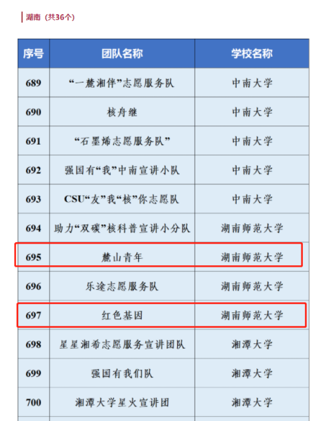 我校一共入选了4个大学生志愿服务团队,而我院2支志愿服务团队光荣入围。“红色基因”志愿宣讲团由化工院20级学生彭玲丽担任负责人,宣讲团将通过宣讲会、知识竞答、主题团日、艺术表演的形式提高大学生及社会公众对习近平生态文明思想、绿色核能发展理念的认识,同时宣传“两弹一星”精神。“麓山青年”志愿宣讲团由化工院20级学生滕蜜担任负责人,宣讲团以“传承中国红”为主题,聚焦红色历史,传承红色文化,深入学习贯彻习近平新时代中国特色社会主义思想,汲取红色文化力量,让红色精神在新征程绽放出更加绚丽的光芒。