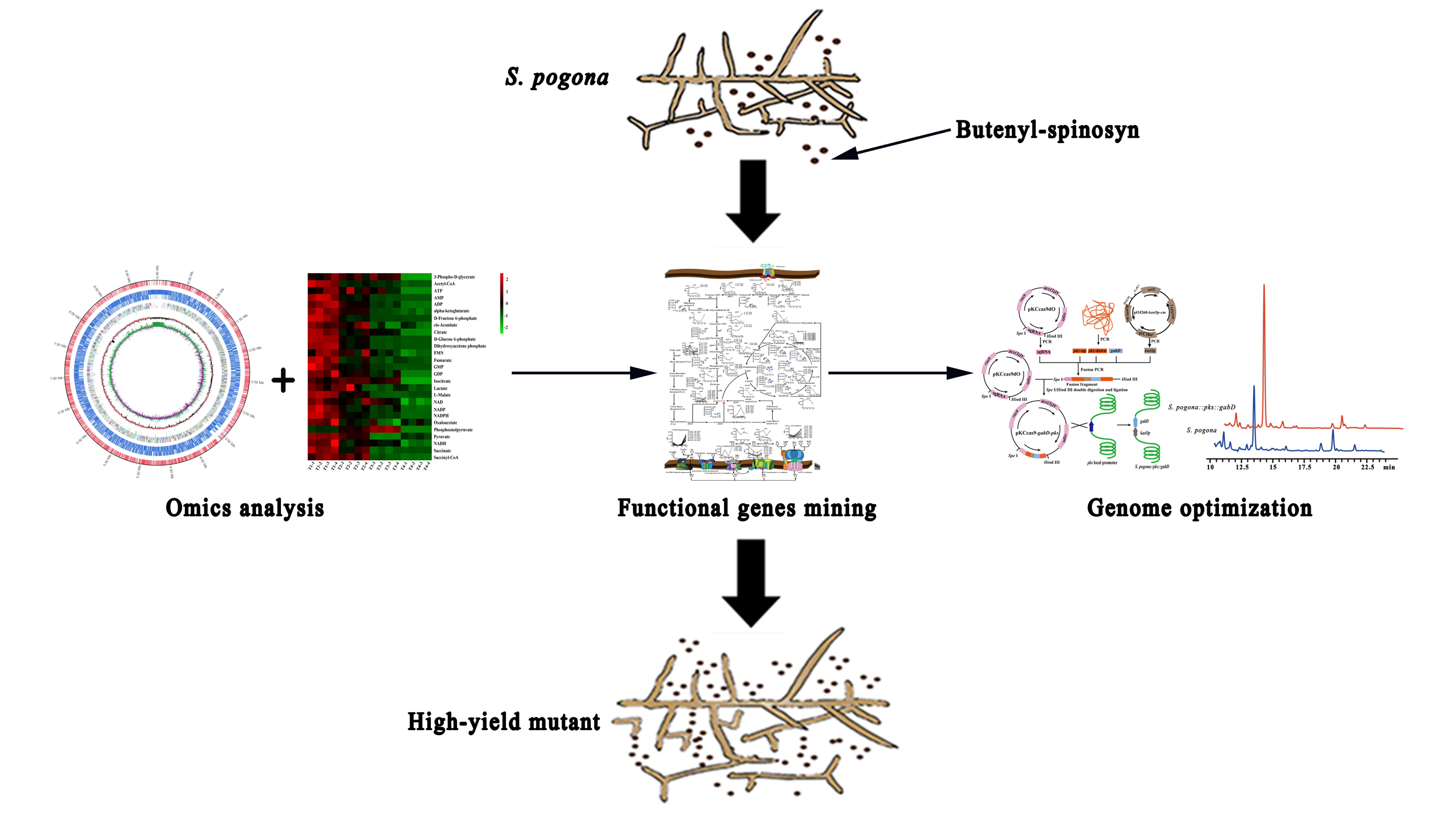 由须糖多孢菌合成的丁烯基多杀菌素,因具有高效、广谱、低毒的杀虫效果,成为当前国际上最具发展前景的生物农药。然而,现有菌株丁烯基多杀菌素合成量极低,如何进一步提高其产量已成为当前该领域的研究热点。近日,我校伟德国际1949博士后研究人员穰杰博士(合作导师谢青季教授)在该领域的研究工作取得重要进展,最新研究论文“Promoting Butenyl-spinosyn Production Based on Omics Research and Metabolic Network Construction inSaccharopolyspora pogona”在《Journal of Agricultural and Food Chemistry》(农林科学Top期刊,JCR Q1,IF 5.279)在线发表(J Agric Food Chem, 2022, 70, 3375-3568),并被遴选为封面论文(Outside Front Cover)。该文中,穰杰博士基于联合多组学分析与组合代谢工程策略,对野生型须糖多孢菌开展了基因组、转录组与靶向代谢组分析,完成了丁烯基多杀菌素生物合成代谢网络构建以及重要功能基因时序表达分析,发现丁烯基多杀菌素聚酮合酶基因簇表达水平低和乙酰辅酶A等前体供应不足是限制野生型须糖多孢菌产量低的重要原因,并对涉及丁烯基多杀菌素生物合成的聚酮合酶基因簇以及前体供应的琥珀酰半醛脱氢酶基因进行过表达,明确其均能促进丁烯基多杀菌素生物合成。采用基因编辑对上述两个功能元件进行共表达,构建了一株工程菌使丁烯基多杀菌素产量提高了6.38倍,为促进丁烯基多杀菌素高效生物合成奠定了重要基础。该研究获得国家自然科学基金、国家国际合作重点项目和省自然科学基金等课题资助。