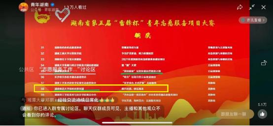 2022年5月23日,湖南省“百万青少年学雷锋”志愿服务交流会暨第五届“雷锋杯”青年志愿服务项目大赛决赛正式举行,此次活动共有120个项目入围,我院有一支志愿服务团队入围。