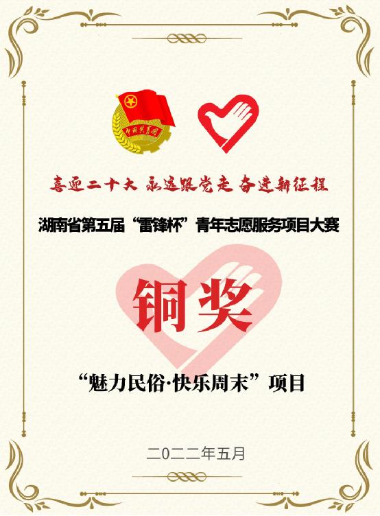 (通讯员 邓星 奚芯蕊)2022年5月26日,伟德国际1949青年志愿服务项目喜获佳绩,“魅力民俗·快乐周末”项目在湖南省第五届“雷锋杯”青年志愿服务项目大赛中获得铜奖。