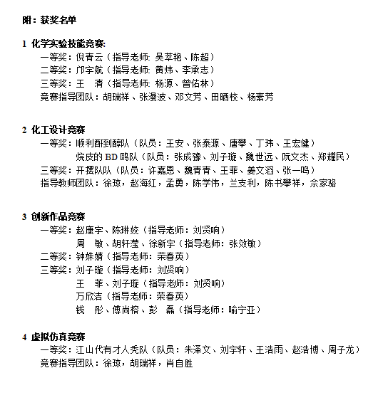 我院高度重视该项赛事,依托化学化工国家级实验教学示范中心进行了精心组织,前期通过校内初赛完成了选手选拔并开展了扎实有效的培训。副院长、实验中心主任谭亮教授作为领队,6名教师带领19名学生参加了现场考核或答辩,最终在化学实验技能竞赛中获一、二、三等奖各1项,在化工设计竞赛获得一等奖2项、三等奖1项,在创新作品竞赛中获一等奖2项、二等奖1项、三等奖4项,在虚拟仿真竞赛获一等奖1项。