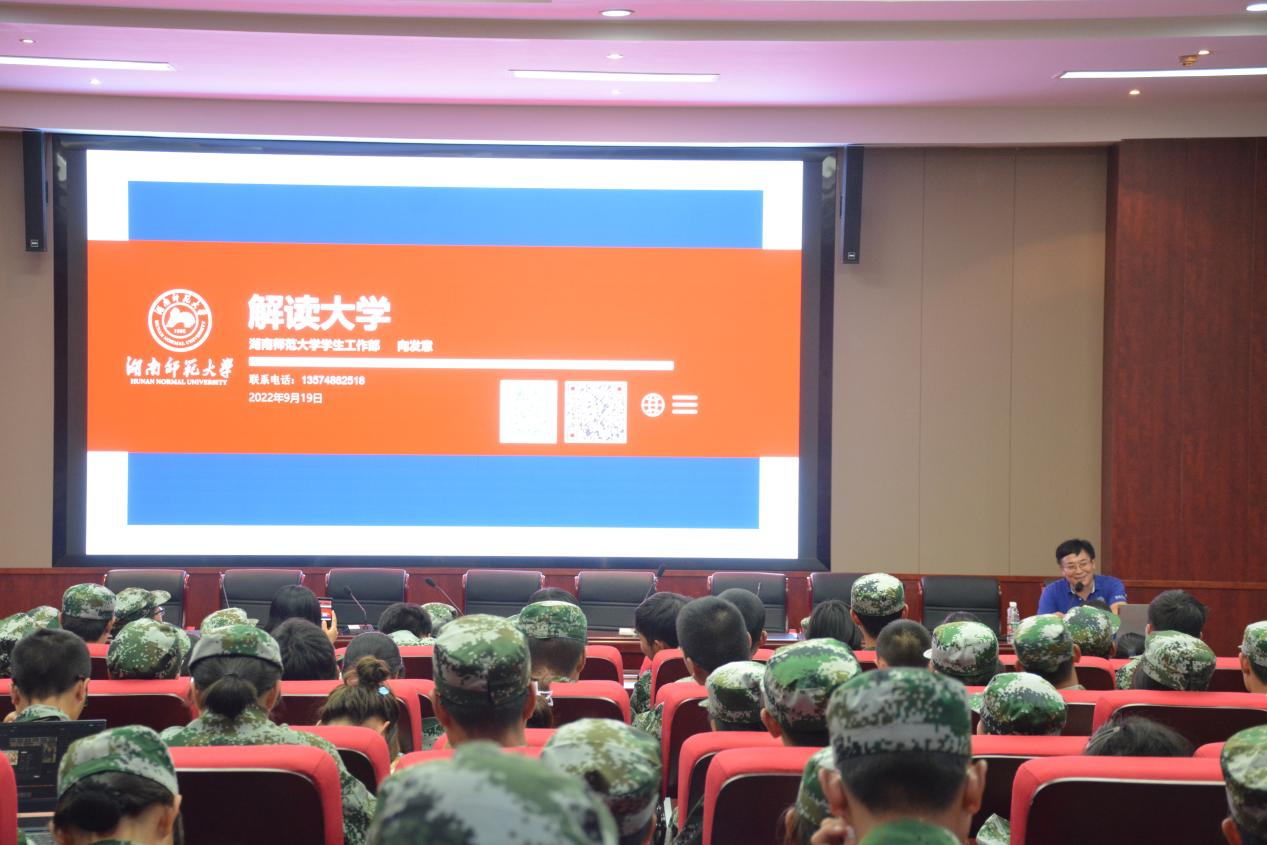 向发意部长从“大学是什么”“大学的发展历史”“何谓一流大学”“如何读大学”四个方面引领学生解读大学。他从西方大学与中国大学的视角分别介绍大学的发展历史,帮助同学们理解大学的设立意义和发展。他就同学们对于“何谓一流大学”的疑问,进行了耐心地讲解,详细说明一流大学需要有一流的生源、大师、成果、氛围、本科教学与设施条件,并列举了世界一流大学名单。他认为,“如何读大学”是大学生最应该思考的问题之一,读大学就是读大学自身、读专业、读大师、读圣书、读社会、读世界、读自然、读同学以及读自我。他希望同学们多学习,多完善自我。他倡导当代大学生应具有国际视野与天下情怀,同时向大家表达了自己对专才与通才的看法:不可一业不专,也不可只专一业。最后,向发意部长借用习近平总书记对青年的六点期盼寄语全体新生——希望同学们能树立远大理想、热爱伟大祖国、担当时代责任、勇于砥砺奋斗、练就过硬本领、锤炼品德修为。