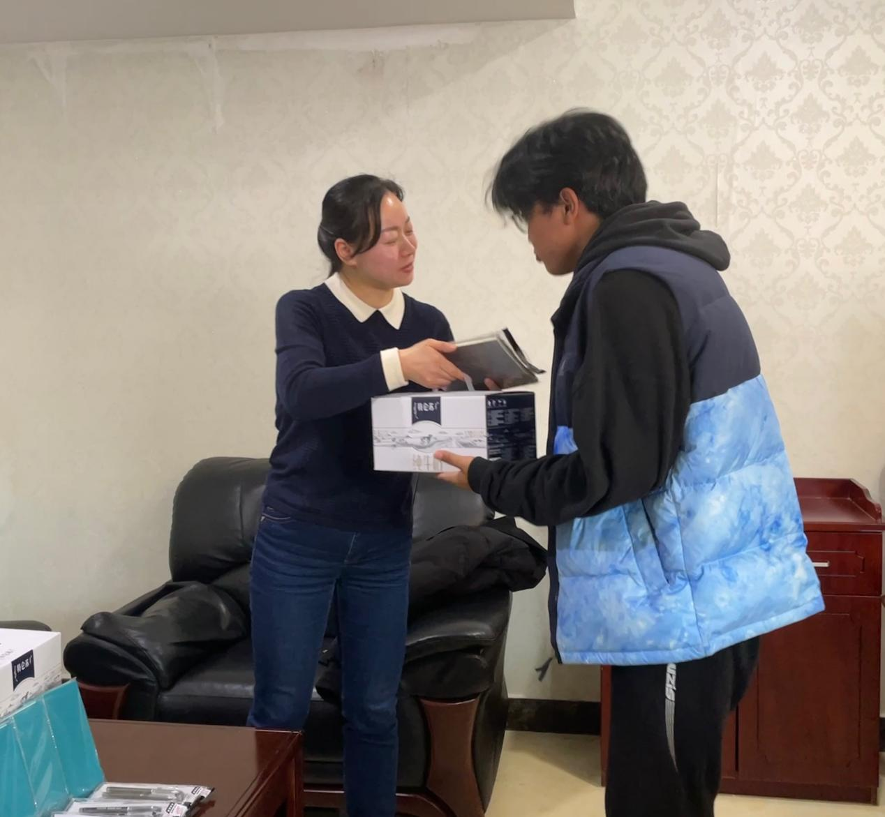 藏族同学们一一进行了自我介绍,并感谢学院和领导老师们的关怀,表示一定珍惜学习机会和大好前途,将自己的所学致力于家乡的经济发展和繁荣。随后,谭东波、段婷代表学院给各位藏族同学送上新年礼物。