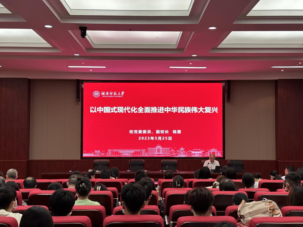 杨震围绕“为什么需要中国式现代化”“什么是中国式现代化”“怎样以中国式现代化全面推进中华民族伟大复兴”三个方面的问题,通过分析中国式现代化所应对的五项中国特色、三大本质要求和五类重大原则,对课题进行了深入阐释。他指出,中国式现代化是实现中华民族伟大复兴的光明大道,广大师生要进一步加强理论学习和实践创新,不断拓展中国式现代化的广度和深度,全面推进强国建设、民族复兴。