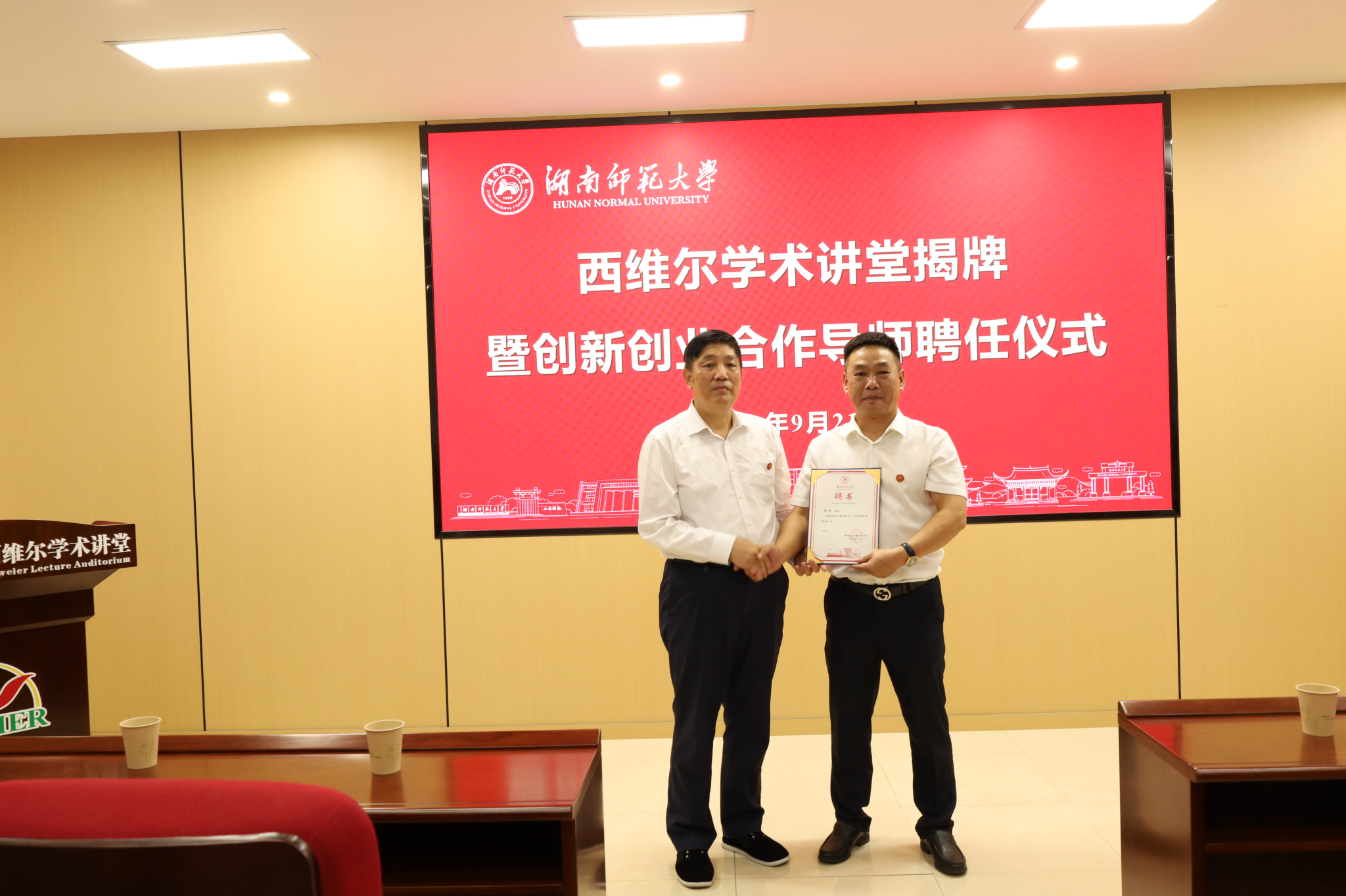 杨荣华与杨仕伟共同为“西维尔学术讲堂”揭牌,并为杨仕伟颁发“创新创业导师证书”。