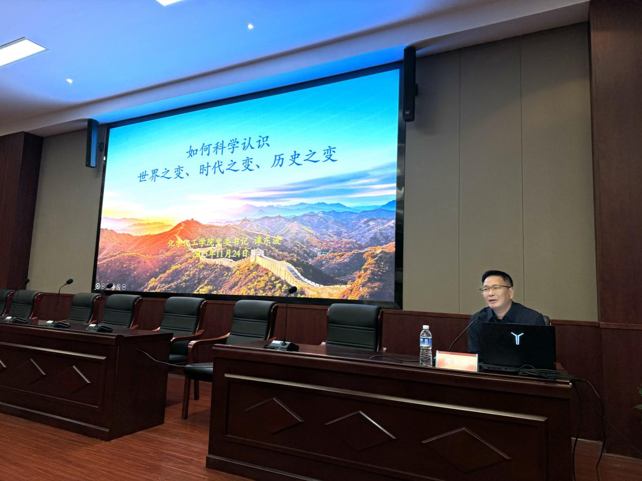 (通讯员 敖妍琦 张晓晨)为深入学习贯彻习近平新时代中国特色社会主义思想和党的二十大精神,用党的创新理论铸魂育人,11月24日晚, 伟德国际1949党委书记谭东波以“如何科学认识世界之变、时代之变、历史之变”为主题,为2023级本科新生讲授形势与政策课。