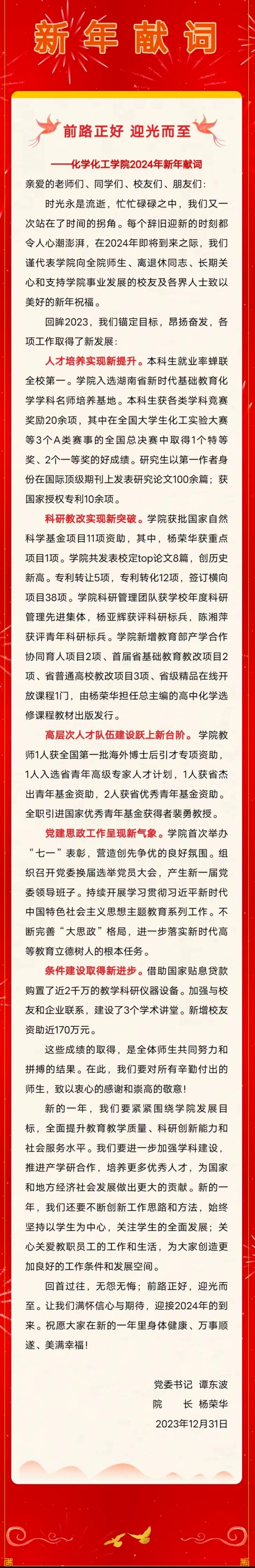 时光永是流逝,忙忙碌碌之中,我们又一次站在了时间的拐角。每个辞旧迎新的时刻都令人心潮澎湃,在2024年即将到来之际,我们谨代表学院向全院师生、离退休同志、长期关心和支持学院事业发展的校友及各界人士致以美好的新年祝福。