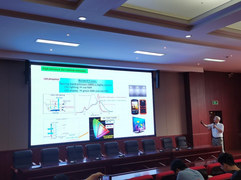 王育华教授的报告题为《无机光转换材料的设计与性能调控》,主要讲述无机发光材料及其在LED、Micro-LED等领域的重要应用,指出Micro-LED用荧光材料的研究痛点。TakatoshiSeto教授的报告题为《Creation of LED phosphors and their phenomena induced by high pressure》,形象展示了其团队研发的几种代表性商用荧光粉及光学性质,并讲述了LED用荧光粉在压力环境下的一些特殊发光现象。学术报告过程中,与会老师和研究生与王教授和Prof.Seto进行了积极的交流和热烈的讨论。邱忠贤副教授、研究生李松、胡伟熟练地用英语、日语与Prof.Seto进行问题讨论,现场气氛十分活跃,显示出我院青年教师和学生良好的素质。两位教授的学术报告和敬业精神使师生们受益匪浅,赢得了师生们的高度称赞。