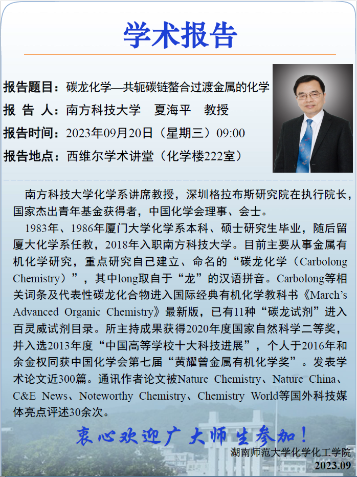 摘要:化学键构筑是化学学科最基础、核心的课题之一。夏团队近20年专注于C-M键构筑这一金属有机学科的核心科学问题。运用独特的共轭碳链和金属源结合,不断挑战金属上C-M键数量的极限,突破了休克尔规则、揭示了“芳香性突变”、证实了半个多世纪前Craig发表于Nature的理论推测[1]。最终,发现了“同花顺”式的Craig型芳香结构基元系列,建立了“碳龙化学”[2]。本次报告将介绍碳龙化学的一系列最新进展[3]。