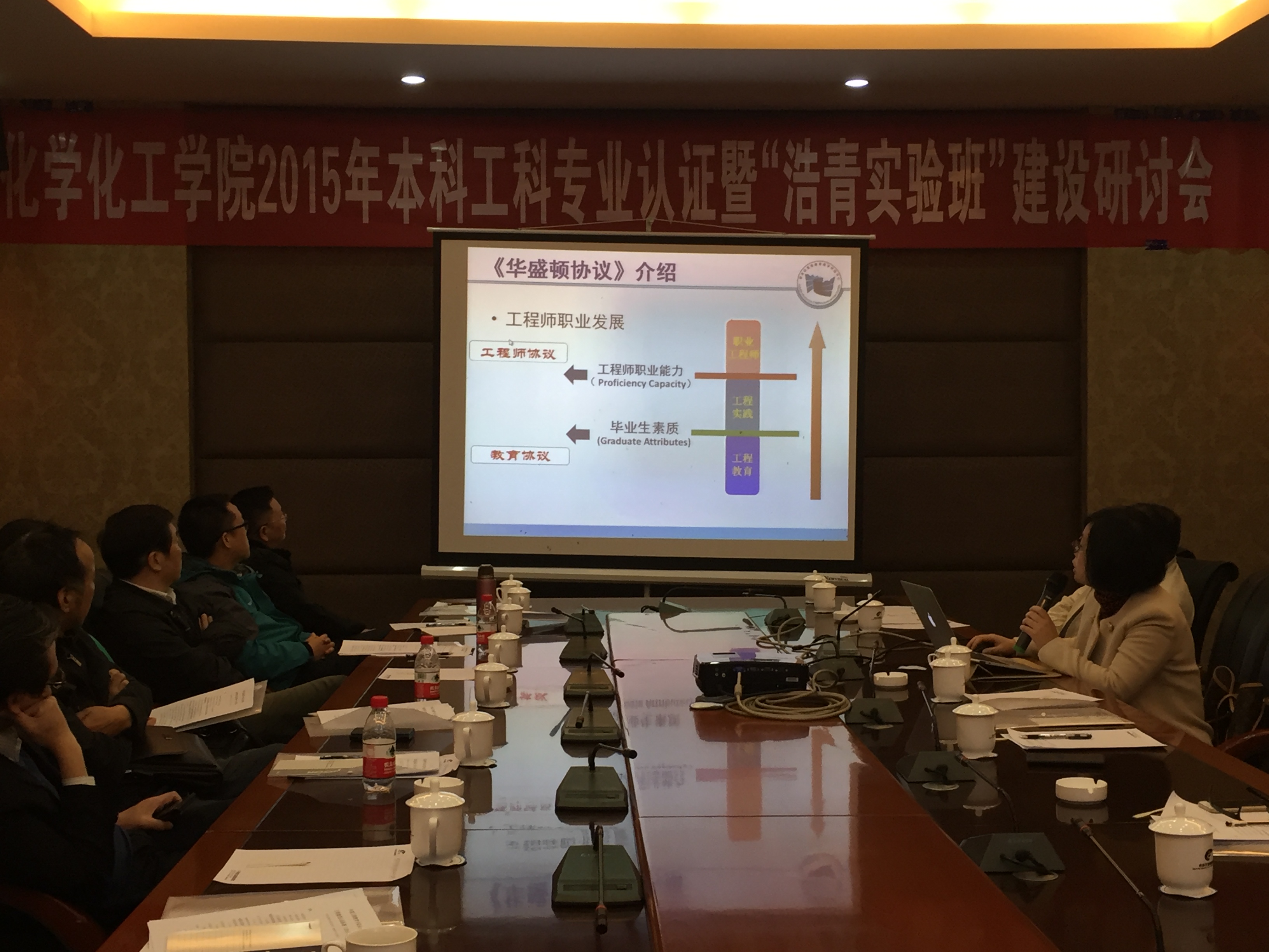 首先是工科教育专业认证情况汇报阶段:化学工程与工艺专业负责人赵海红老师和制药工程专业负责人钟世华老师分别就化学工程与工艺专业和制药工程专业的教育评估认证做了详细的汇报,并就这两个专业的发展提出了许多建设性意见。