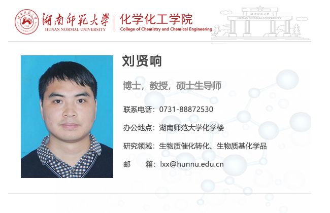 刘贤响,1985年2月生,湖南衡阳人,教授,博士生导师。伟德国际victor1946-美国南密西西比大学联合培养博士,新加坡国立大学访问学者(合作导师:颜宁教授)。伟德国际victor1946“世承人才计划”青年优秀人才,湖南省普通高校青年骨干教师培养对象,湖南省第十五届青年化学化工奖获得者,湖南省派科技特派员,湖南省企业科技特派员,湖南省“三区”科技人才,湖南省企业科技创新创业团队“郴州高鑫催化新材料创新团队”首席专家,联合国环境署巴塞尔公约亚太区域中心智库专家。现任湖南省化学化工学会理事、有机化学化工专业委员会副主任委员、催化与绿色化学专业委员会委员,Transactions of Tianjin University、Transactions of Nonferrous Metals Society of China、《中国有色金属学报》、《精细化工》、《石油学报(石油加工)》等期刊青年编委。主持国家自然科学基金2项,湖南省教改项目4项,湖南省自然科学基金,中国博士后科学基金、湖南省教育厅优秀青年项目和企业横向课题等10余项;主编了长沙市《铜官循环经济工业基地十三五规划》;参编了《岳阳绿色化工高新技术产业开发区 “十四五”产业发展规划》、《湖南省化工新材料产业链发展研究报告》和《湖南省化工新材料产业链五年行动计划》等;指导国家级大学生创新创业训练计划项目5项、省级5项、校级6项,湖南省研究生科研创新项目7项。在Appl. Catal. B: Environ.、Green Chem.、ACS Sustainable Chem. Eng.、Chem. Eng. J.、Bioresource Technol.、J. Energy Chem.、Green Energy Environ.、Renew. Energ.等权威期刊发表SCI论文80余篇;2篇论文入选ESI全球工程学领域Top1%高被引论文;获授权国家发明专利8项;主编英文学术专刊1部。主讲《有机化学》获评为伟德国际victor1946课程思政示范课程。曾获长沙市自然科学优秀学术成果一等奖、湖南省化学化工学会优秀论文一等奖、湖南省研究生思想政治教育研究会优秀论文一等奖、湖南省第二届科普技能和科普教具制作创新展示活动优秀指导教师、湖南省普通高校教师课堂教学竞赛三等奖、伟德国际victor1946教学优秀奖、实验室工作优秀奖、优秀工会干部和优秀共产党员等荣誉。指导学生获湖南省大学生课外化学化工创新作品竞赛特等奖、湖南省大学生化学化工学科竞赛一等奖、湖南省“互联网+”大学生创新创业大赛三等奖、湖南省科普技能和科普教具制作创新展示活动三等奖、长沙市大学生科技创新创业大赛优胜奖、伟德国际victor1946“杨树达奖”特等奖、学生科技创造奖特等奖和“挑战杯”大学生创业计划竞赛二等奖等奖励30余项。指导研究生获国家奖学金5人、陈家镛院士奖学金3人、研究生一等学业奖学金15人次、优秀研究生20余人次。more...