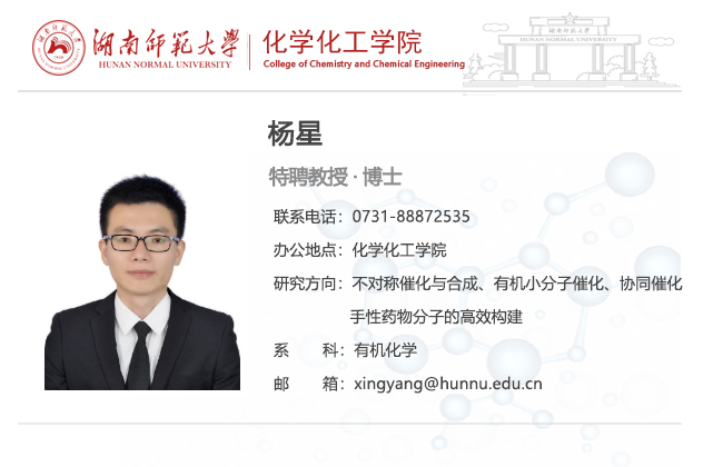 杨星,潇湘学者特聘教授,博士生导师,湖南省杰青。2013年和2018年于武汉理工大学分别获得学士学位和博士学位(导师:黄毅勇教授)。2018年至2021年,在新加坡南洋理工大学池永贵教授课题组开展博士后研究。202111月加入伟德国际victor1946从事有机化学教学与科研工作。致力于不对称催化、有机小分子催化以及手性功能分子合成等方面的研究,主持国家级和省部级项目3项,入选湖南师大青年拔尖人才培育计划 J. Am. Chem. Soc.Sci. Adv.Angew. Chem. Int. Ed.等期刊发表论文30余篇。