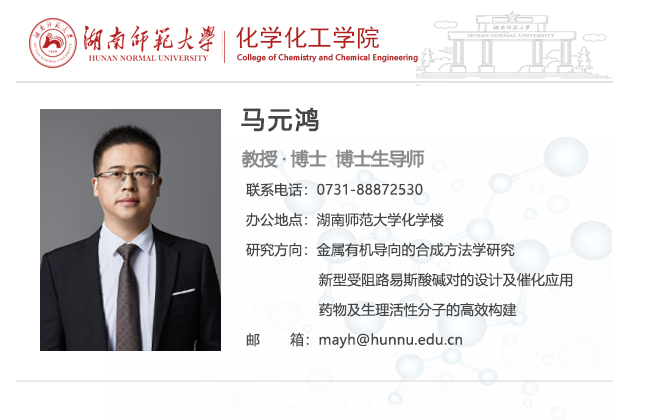 马元鸿,男,教授,“潇湘学者”特聘教授,湖南省高层次计划人才。2008年和2011年分别于西北师范大学获得理学学士和理学硕士学位(导师:李政教授),2014年于四川大学有机化学专业获得理学博士学位(导师:游劲松教授)。2014年9月至2018年1月,在日本国立理化学研究所从事博士后研究(合作导师:侯召民教授)。2018年2月至2019年12月,在德国马克斯-普朗克煤炭研究所开展博士后研究(合作导师:J. Cornella博士)。2020年1月高层次人才引进加入伟德国际victor1946从事有机化学相关的教学与科研工作。近年来一直致力于金属有机化学、有机合成化学、有机功能材料等方面的前沿研究,主持和参与了包括国家863计划、国家自然科学基金项目在内的诸多科研项目,在所从事的领域取得了一系列开拓性研究进展,截至目前,已经在Chem. Soc. Rev.、J. Am. Chem. Soc.、Angew. Chem. Int. Ed.、ACS Catal.、Org.Lett.、Chem. Commun.、Chem. Eur. J等国际知名化学期刊发表论文20余篇。