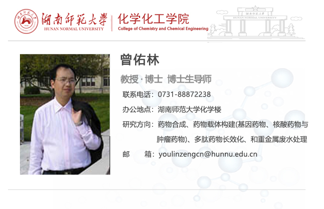 曾佑林,男,1974 年8 月出生。博士、教授,伟德国际1949博士生导师(化学)、硕士导师(有机化学、学科教学(化学)。“化学生物学及中药分析”教育部重点实验室、“石化新材料与资源精细利用”国家地方联合工程实验室、“有机功能分子组装与应用”湖南省重点实验室、“资源精细化与先进材料”湖南省高校重点实验室领成员,厦门市“双百计划”军创业人才。2004年在中国科学院生态环境研究中心获理学博士学位;2004.7-2006.9年在伟德国际1949从事教学科研工作,从事材料化学、环糊精聚合物超分子化学研究工作和有机医药中间体的开发工作;2006.9至2008.5,在美国the University of Toledo黄雪飞教授组从事博士后研究,主要从事寡糖化学合成及应用低温核磁技术研究糖苷化反应机理等研究工作。现主要从事药物合成、药物载体构建(基因药物、核酸药物与肿瘤药物)、多肽药物长效化、和重金属废水处理等研究。近年来,主持并完成湖南省教育厅伟德国际基金项目和教育部“留学回国人员科研启动基金”项目各1 项,主持国家自然科学基金项目2项,参与完成“863计划”项目1项。在J. Med. Chem.、J. Org. Chem、Org. Lett.、Carbohydr. Res.、Org. Biomol. Chem.、Mol. Pharmaceutics等SCI 收录期刊上发表了论文30余篇,专利授权6项。