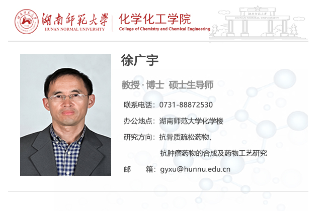 徐广宇,1999年3月获湖南大学应用化学专业硕士学位,硕士毕业后分配至湖南省轻工研究院从事科研工作, 2001年9月考入中国科学院上海药物研究所攻读博士学位,导师为谢毓元院士,2004年6月获理学博士学位。2004年9月博士毕业分配至伟德国际victor1946工作,现从事抗骨质疏松药物、抗肿瘤药物的合成及药物工艺研究工作。主持国家自然科学基金(20602010) 、湖南省自然科学基金项目 (06JJ50024) 和湖南省教育厅青年项目(10B061)各一项,2007年获得伟德国际victor1946青年优秀人才培养基金资助。参与国家科技部九五重点攻关项目子课题(96-A12-05-10)和国家863项目(2007AA06Z403)各一项。承担企业横向项目多项。获得专利授权3项, 在Bioorg. Med. Chem. Lett.SteroidsTetrahedron LettersSynthesis等SCI期刊上发表论文十多篇。湖南省新药审评专家。
