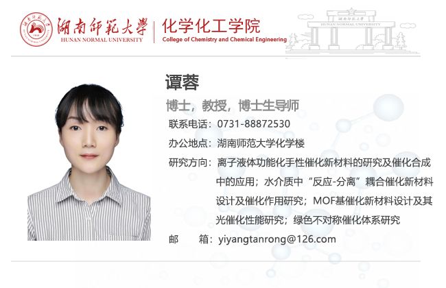 谭蓉,理学博士,教授,博士生导师。湖南省杰青。湖南省121人才工程第二层次人选,入选“湖湘青年英才培养计划”。围绕精细化学品的绿色催化合成开展研究,获得了一批原创性的研究成果,引起国内外同行的高度关注。以通讯/第一作者,在J. Catal.,Green Chem., Chem. Commun.等刊物发表高水平研究论文50余篇,论文被SCI引用1000余次。获授权国家发明专利6项。作为第1完成人,获湖南省自然科学奖二等奖、离子液体与绿色过程青年创新奖和湖南省青年化学化工奖等多项荣誉。先后主持国家自然科学基金(4项)和湖南省杰出青年基金等多项课题。担任中国化工学会离子液体专业委员会委员。