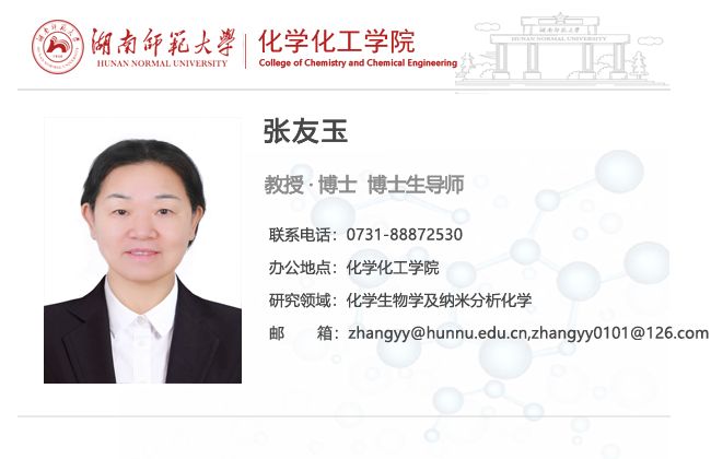 张友玉,博士,二级教授,博士生导师。主要从事化学生物学及纳米分析化学等领域的研究。主持国家自然科学基金面上项目5项,国家基金重点项目协作项目1项,省部级重点及一般项目10余项。以第一作者和通讯作者在Sci. Adv.,Angew. Chem. Int. Ed., Anal. Chem., Chem. Commun.等国际著名刊物上发表高水平研究论文200余篇,获国家授权发明专利7项。获湖南省自然科学奖二等奖1项,湖南省科学技术进步奖二等奖1项,中国分析测试学会科学技术奖(CAIA奖)二等奖1项。获2018年伟德国际victor1946芙蓉百岗明星称号。
