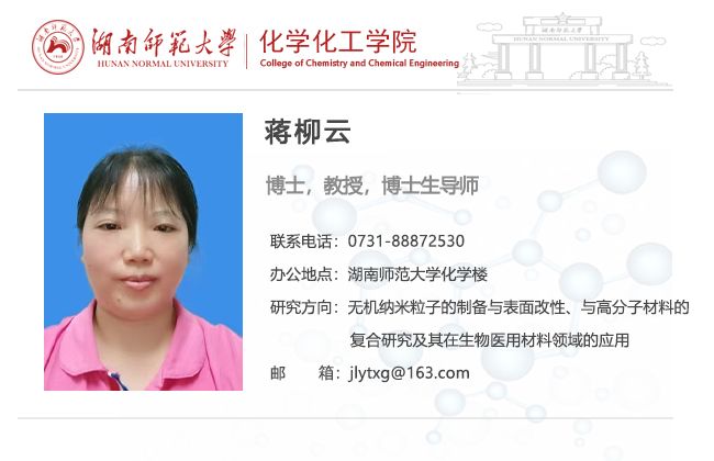 蒋柳云,2005年6月获四川大学无机化学专业硕士学位, 2008年6月获四川大学生物医学工程专业博士学位,2008年7月加入中国科学院成都有机化学研究所工作,2015年9月调入伟德国际1949任教。长期以来一直从事无机纳米粒子的制备与表面改性、与高分子材料的复合研究及其在生物医用材料领域的应用研究。已主持完成了国家自然科学基金、中科院西部之光人才培养项目、四川省杰出青年基金及湖南省自然科学基金等科研项目10余项。至今以第一作者或通讯作者身份在在ACS Appl. Mater. Inter.,Compos. Part B-Eng.,Int. J. Biol. Macromol.Mat.Sci.Eng.C-Mater.等期刊上发表SCI论文40余篇,并获授权国家发明专利10余项。