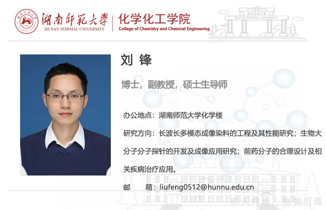 刘锋,男,博士,副教授,硕士生导师。2014年7月获江西师范大学化学(师范类)学士学位,2017年6月获湖南大学化学工程硕士学位(导师:俞汝勤院士),2020年7月获湖南大学分析化学博士学位(导师:俞汝勤院士);同年8月加入湖南大学伟德国际1949化学工程与技术博士后流动站进行博士后研究工作(合作导师:蒋健晖教授)。主要从事有机小分子生物传感及在癌症及心脑血管疾病等重大疾病的活体成像分析及靶向药物传输方面的研究。目前以第一/通讯作者在Angewandte Chemie International Editioin、Chemical Science、Analytical Chemistry、Analyst、Food Chemistry等国际知名学术期刊上发表论文7篇,申请中国发明专利3项,其中2项已授权;主持国家自然科学基金面上项目1项、国家自然科学基金青年项目1项、湖南省自然科学基金青年项目1项和中国博士后面上基金项目二等资助1项,作为核心骨干参与国家自然科学基金重大研究项目1项。