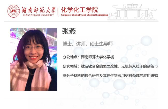 张燕,女,博士,硕士生导师。长期从事钛及钛合金的表面改性、无机纳米粒子的制备与高分子材料的复合研究及其在生物医用材料领域的应用研究。已在国内外期刊发表多篇论文及专利。主持两项校企合作项目,参与国家自然科学基金、湖南省自然科学基金、长沙市科学技术局等多项项目。获得伟德国际victor19462022年青年教师课堂教学竞赛二等奖。