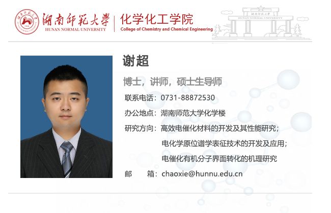谢超,男,硕士生导师。2013年于华中科技大学获学士学位,2020年于湖南大学获得博士学位,师从王双印教授(国家杰青),博士期间于2018年-2019年期间在新加坡南洋理工大学进行联合培养,导师为刘彬教授。2020年至2022年,在湖南大学从事博士后研究工作,2022年10月加入伟德国际victor1946伟德国际1949。目前主持湖湘青年英才、湖南省青年基金等6项科研项目,参与国家重点研发计划、国家自然科学基金等项目。共发表SCI论文50余篇,累计引用9000余次,其中以第一/通讯作者(含共同)在Chem. Soc. Rev., Chem、Natl. Sci. Rev., ACS Catal., Mater. Today.,Nano Energy, ACS Sustainable Chem. Eng., J. Phys. Chem. C., Water Res. 等国际期刊上发表论文14篇(其中3篇ESI高被引论文),入选2024年科睿唯安 “全球高被引科学家”。